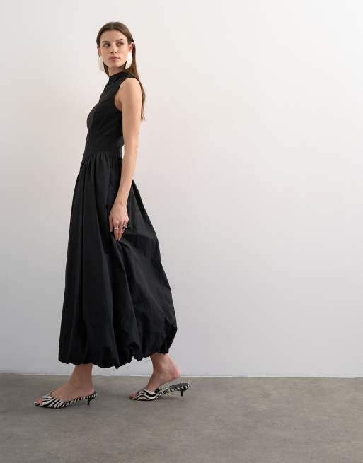 Topshop high neck asymmetric waist bubble hem maxi dress in black