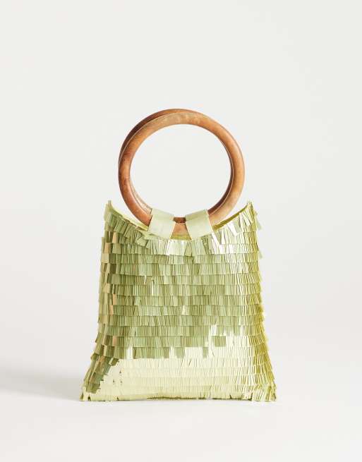 Topshop Holly sequin grab bag with wooden handle in lime