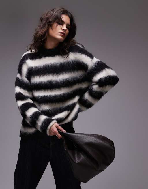 Topshop knitted boysy ultra fluffy stripe oversized jumper in mono