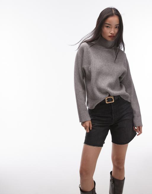Topshop knitted clean rib funnel jumper in grey