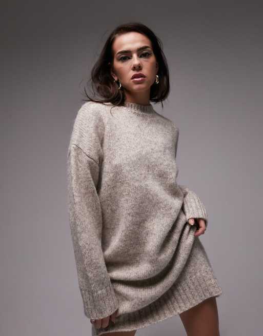 Topshop knitted crew neck mini jumper dress in mink
