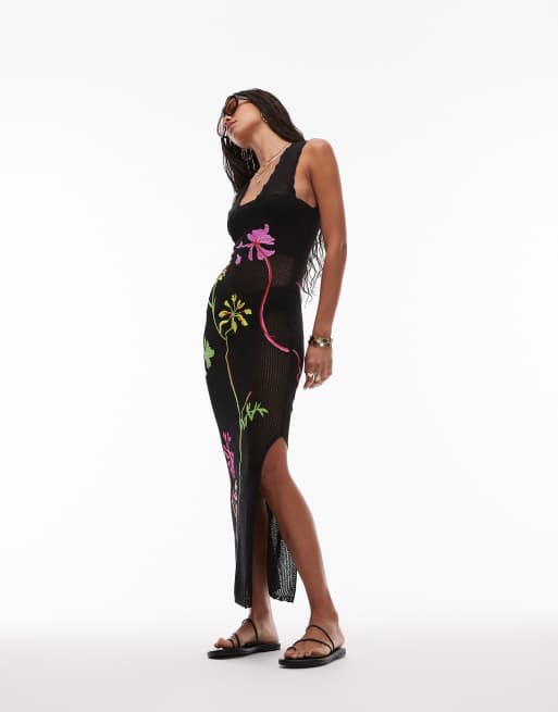 Topshop knitted embroidered dress in black