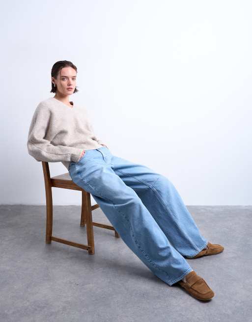 Topshop knitted high v horizontal stitch jumper in oat