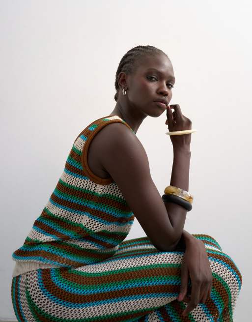Topshop knitted multi stripe co-ord vest in blue and brown