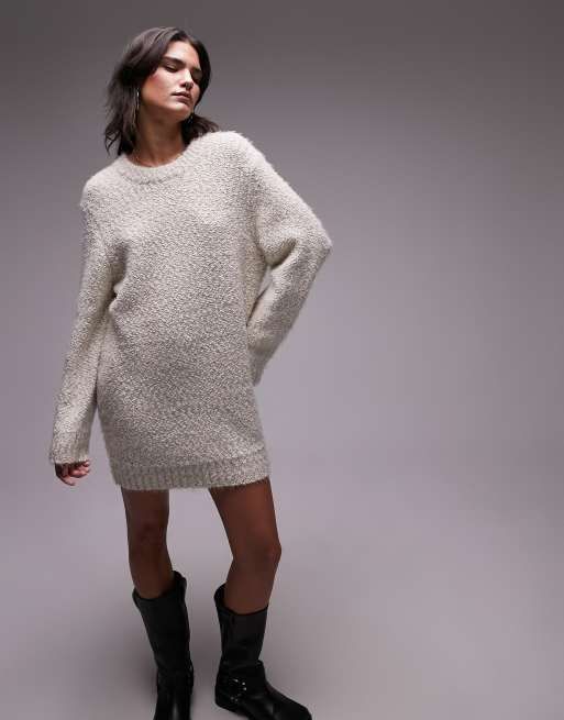 Topshop knitted oversized boucle crew neck mini dress in oat