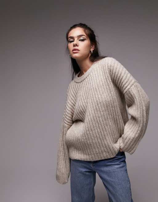 Topshop knitted ribbed crew jumper in oat