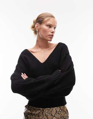 Topshop knitted ribbed jumper with volume sleeves in black