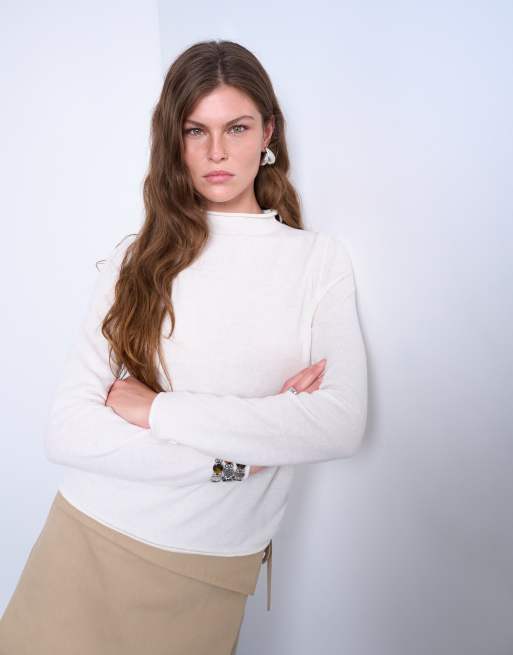Topshop knitted sheer high neck jumper in ivory