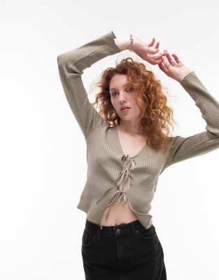 Topshop knitted tie front top in khaki