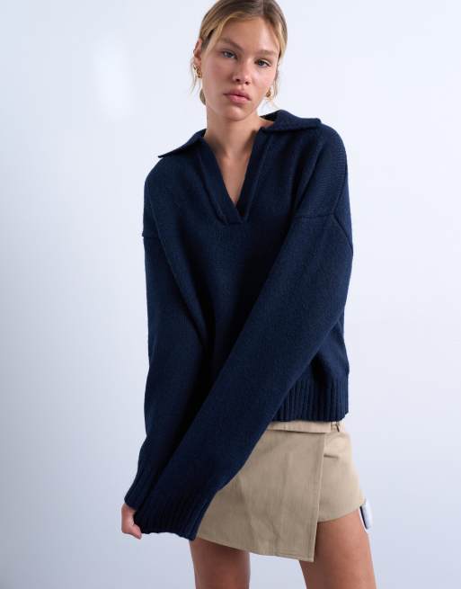 Topshop knitted v neck collar jumper in navy