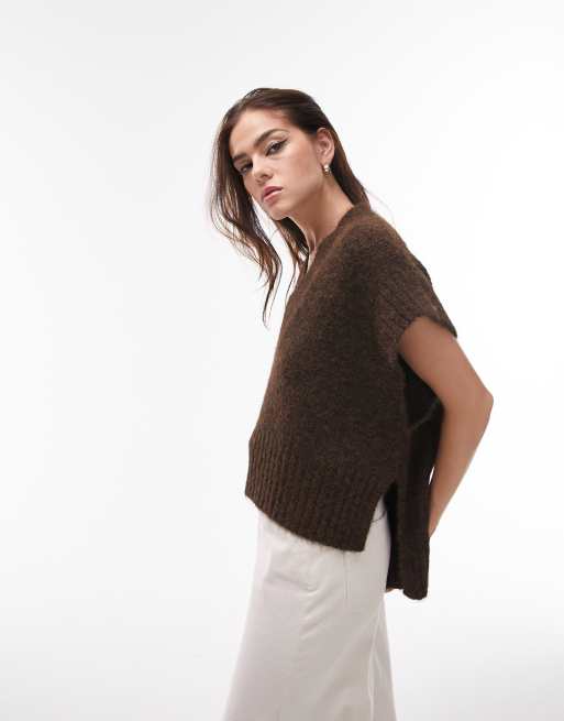 Topshop knitted v-neck fluffy tank jumper in chocolate brown