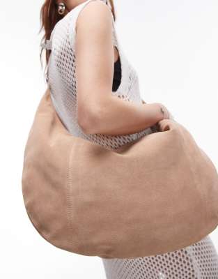 Topshop Lana leather oversized scoop shoulder bag in beige suede