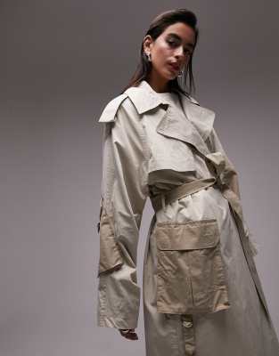 Topshop long-line utility patch pocket trench in light and dark khaki