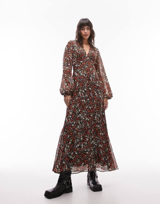 Topshop long sleeve midi tea dress in red floral print