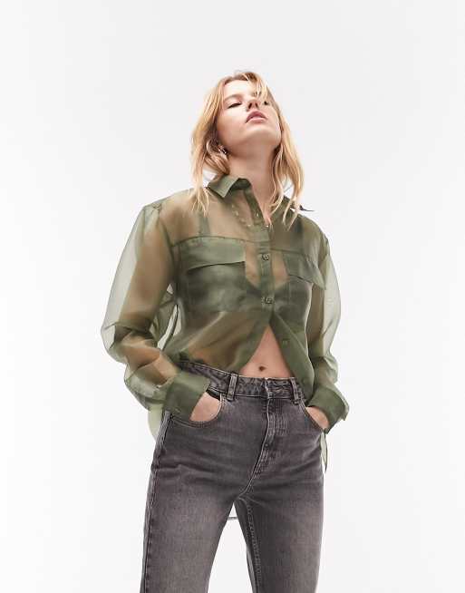 Topshop long sleeve organza sheer shirt with pockets in khaki