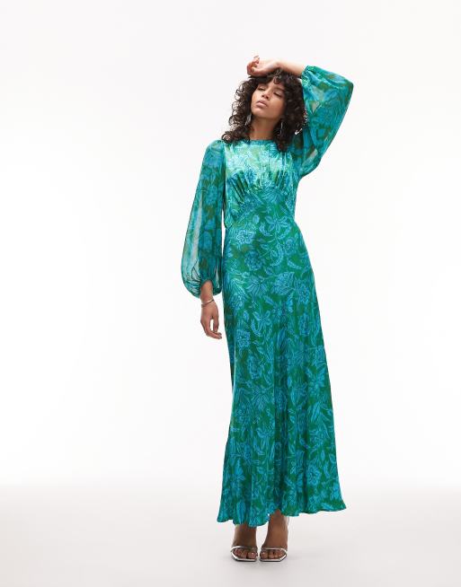 Topshop long sleeve satin maxi dress with bust seam in green floral print