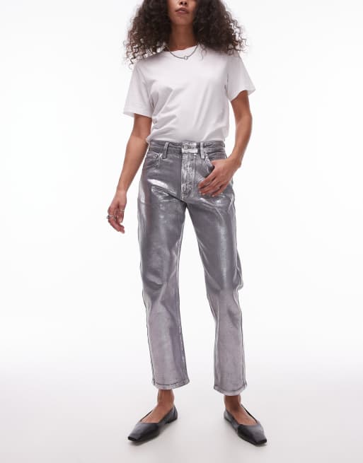 Topshop mid rise straight cropped silver foil jean in grey