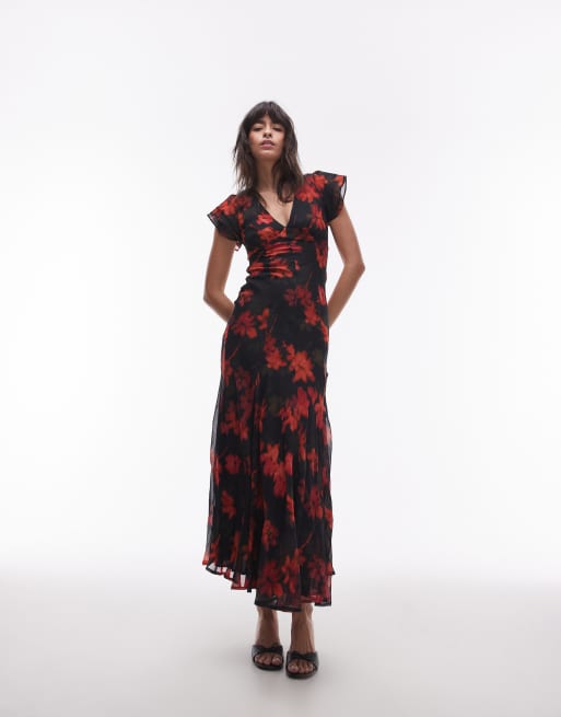 Topshop occasion lace up back maxi dress in black based ditsy floral