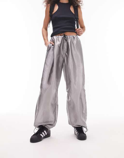 Topshop oversized balloon nylon parachute trouser in metallic silver