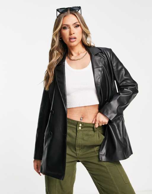 Topshop oversized faux leather blazer jacket in black