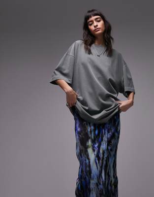 Topshop premium basic acid wash longline extreme oversized crew neck tee in sage