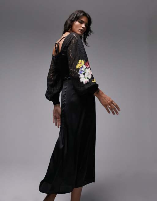 Topshop premium satin and lace occasion midi dress with colourful embroidery in black