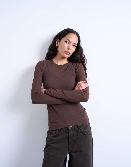 Topshop premium sheer rib double layer long sleeve top in chocolate