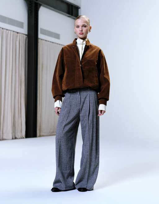 Topshop raw hem low slung double pleated tailored trouser in dark charcoal