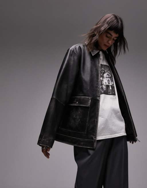 Topshop real leather zip through 90s jacket with pockets in washed black