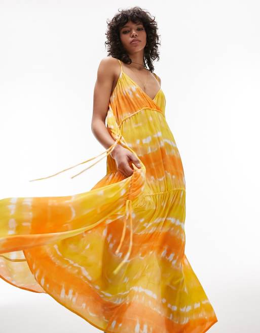 Topshop ruche tie side maxi beach dress in orange and yellow