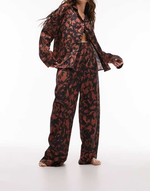 Topshop satin abstract print piped shirt and trouser pyjama set in chocolate