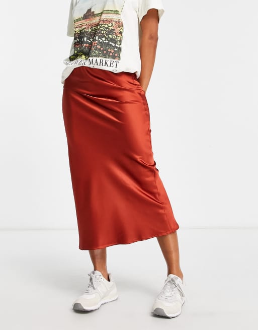 Topshop satin bias midi skirt in rusty red