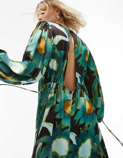 Topshop satin long sleeve midi dress in bold green print