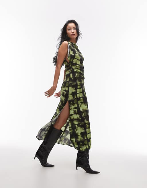 Topshop sliced sleeve ruched side maxi dress in green check print