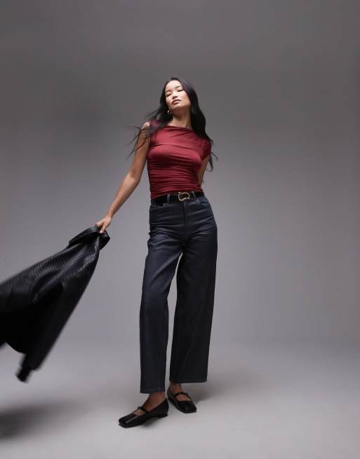 Topshop slinky asymmetric off the shoulder top in burgundy