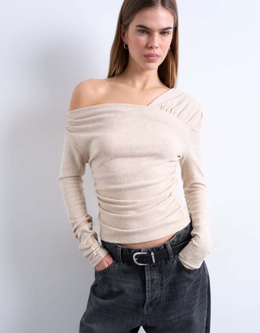 Topshop soft touch ruched off shoulder long sleeve top in oat marl