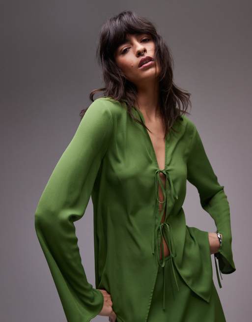 Topshop split sleeve collar crepe top in olive green