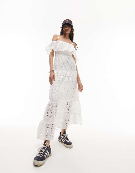 Topshop strappy broderie maxi dress with frill neck in ivory