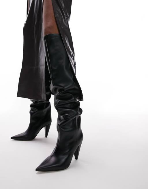 Topshop Tabitha premium leather cone heel knee high boot in black