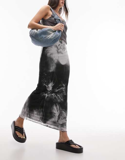 Topshop textured plisse blurred floral print midi skirt in mono