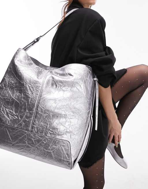 Topshop Tilly oversized buckle tote bag with folded detail in silver