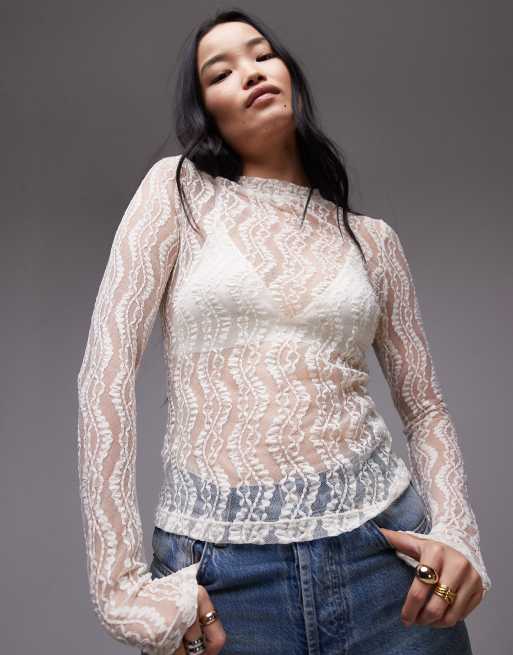 Topshop wave lace high neck top in ivory