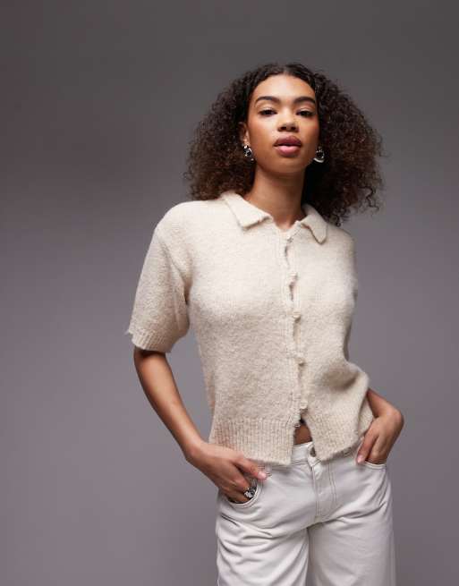 Topshop wool blend button down shrunken knit shirt in ecru