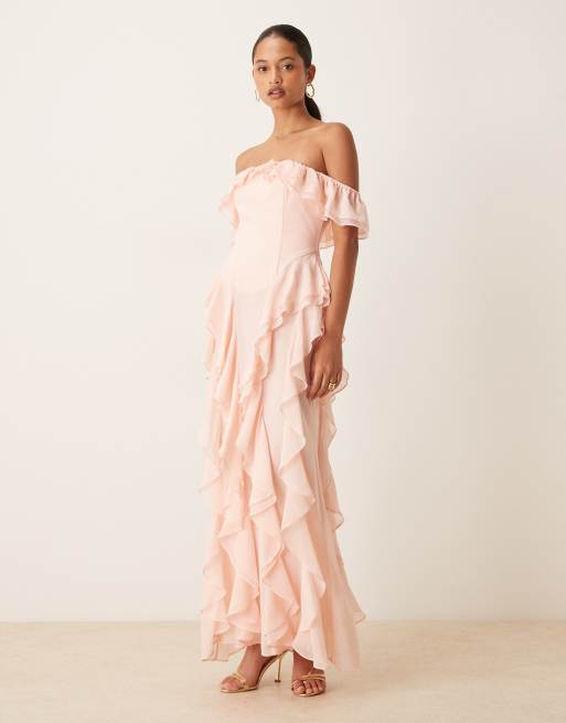 True Decadence Bardot ruffle maxi dress in pale pink