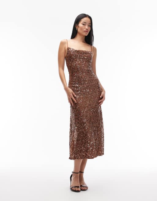 True Decadence Bias cut strappy sequin maxi dress in tan sequin