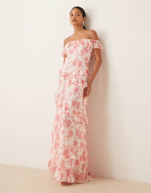 True Decadence Cold shoulder asymmetric ruffle hi-low dress in rose pink floral