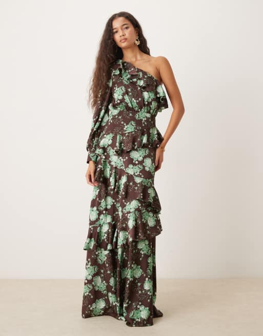 True Decadence One shoulder ruffled layered maxi dress in brown sage rose