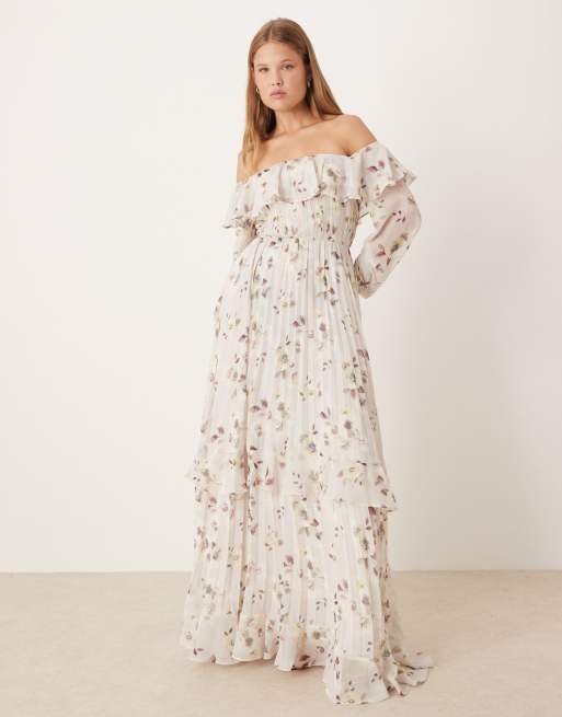 True Decadence Ruffle bardot maxi dress in mauve blurred floral
