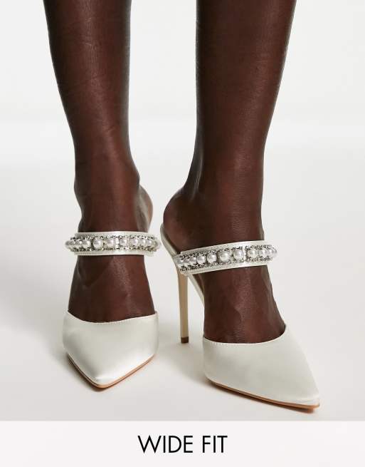 Truffle Collection Wide Fit bridal heeled mules with pearl embellishment in white