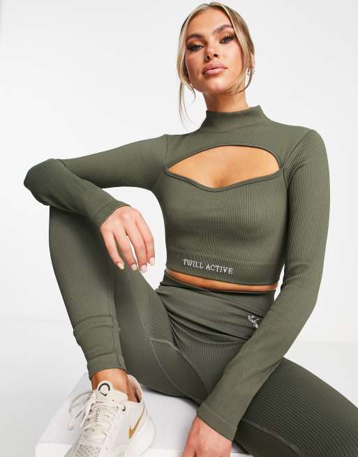 Twill Active long sleeved seamless cut out crop top in khaki - DGREEN